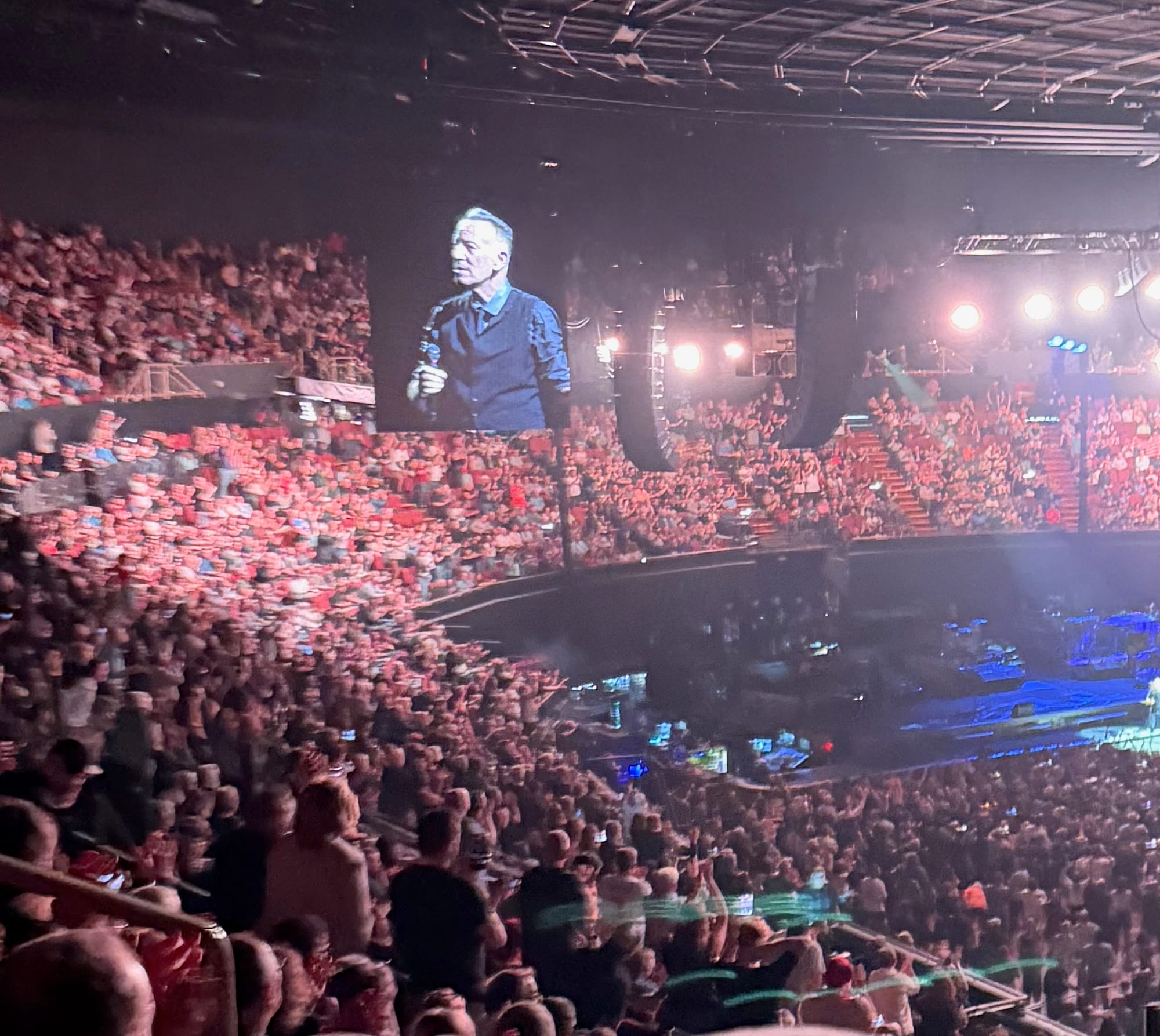 As I was dog-trotting my way alongside the shadowy aisles of Kia Forum as the house lights dimmed, a sole spotlight fixed Bruce at stage front. Before any music, before a glimpse of the band, came his deeply felt incantation of sorts: :“I want to begin the night with a prayer for our men and women in service overseas — we pray for their safe return. The mighty E Street Band is here tonight to call upon the righteous power of art, of music, of rock ‘n’ roll in dangerous times. We are here in celebration and defense of our American ideals, democracy, our Constitution, and our sacred American promise. The America I love, the America that I’ve written about for 50 years that’s been a beacon of hope and liberty around the world, is currently in the hands of a corrupt, incompetent, racist, reckless and treasonous administration. Tonight, we ask all of you to join with us in choosing hope over fear, democracy over authoritarianism, the rule of law over lawlessness, ethics over unbridled corruption, resistance over complacency, unity over division, and peace over…”