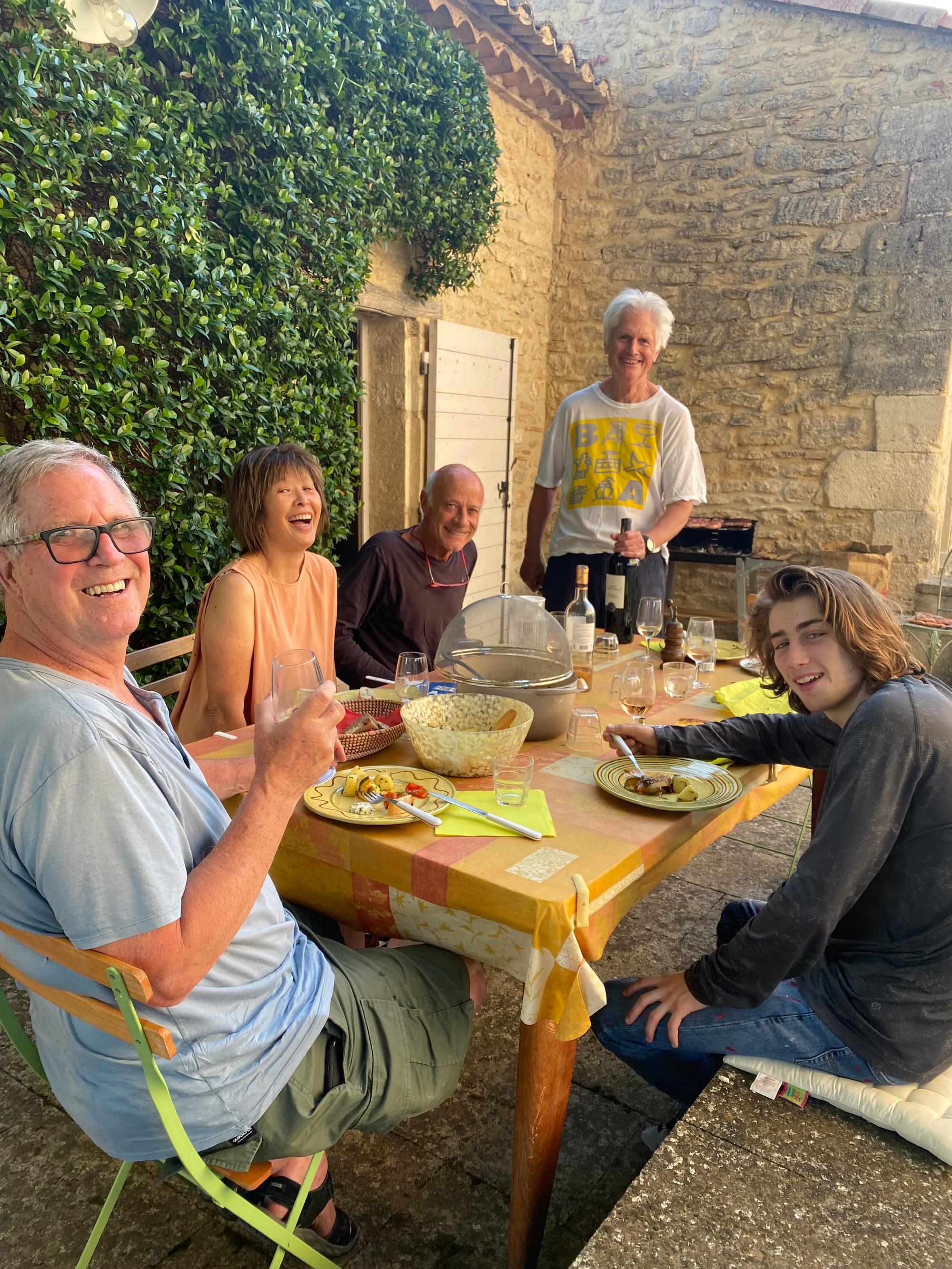 So, this yuppie “Deliverance” saga has an epilogue of sorts, stretching four decades to the above, as a group sits telling the stories that refuse to be retired. My son Ridley, 20, is seen at his indoctrination. We got the band together for a typical semi-annual meet-up, this time at the Southern France vineyard-side retreat of pal John (standing as wine preparator), with his wife Chiyoko to the right of Marc. Tom, in the foreground, is the one who conspired with Marc (and our pal Rohan) to come up with Ridley’s plane ticket and more, setting up a sybaritic pilgrimage from London to Paris to the sunny French provinces.