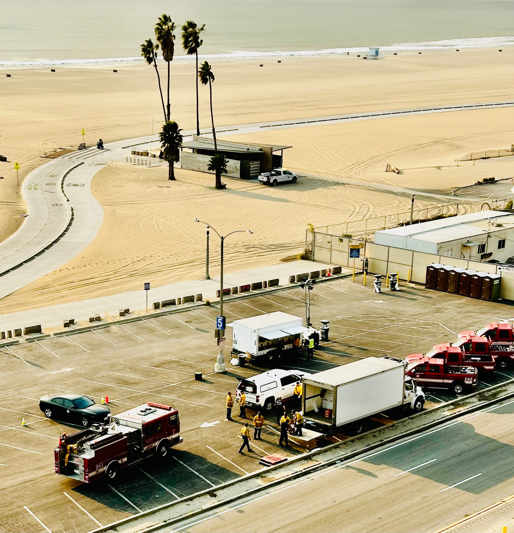 View from the Palisades Bluffs Park of an LAFD command and truck servicing center along the Pacific Coast Highway in Santa Monica, January 9